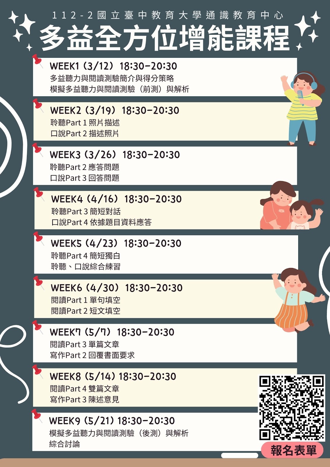 ※ 上課時間:2024-03-12 ~ 2024-05-21 每週二 18:30 ~ 20:30 (4月2日、9日因清明連假及期中考週停課)