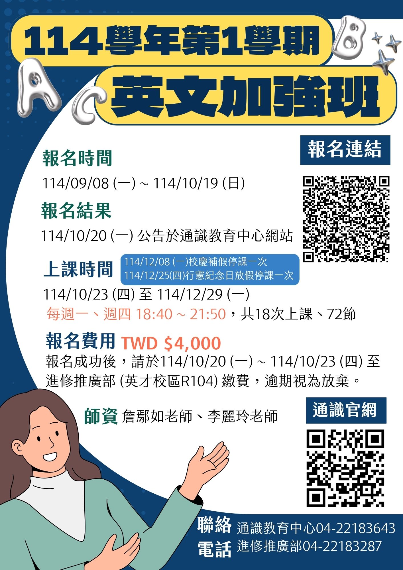 ※英文加強班繳費、請假等相關問題請洽進修推廣部04-22183287。