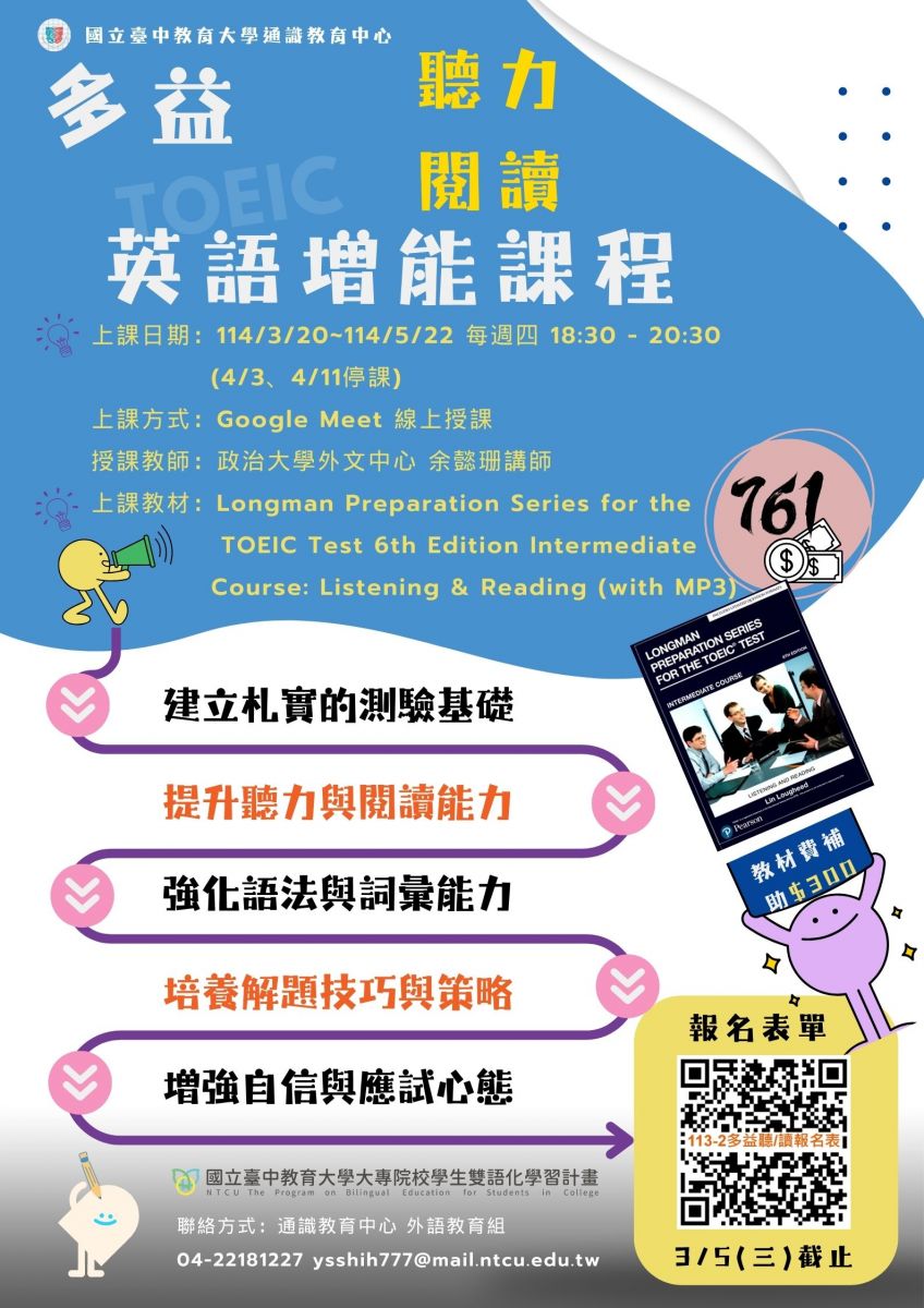 ※ 教材繳費方式:完成表單報名後,請於3月7日(五) 17:00前至通識教育中心(R307)找施小姐繳費