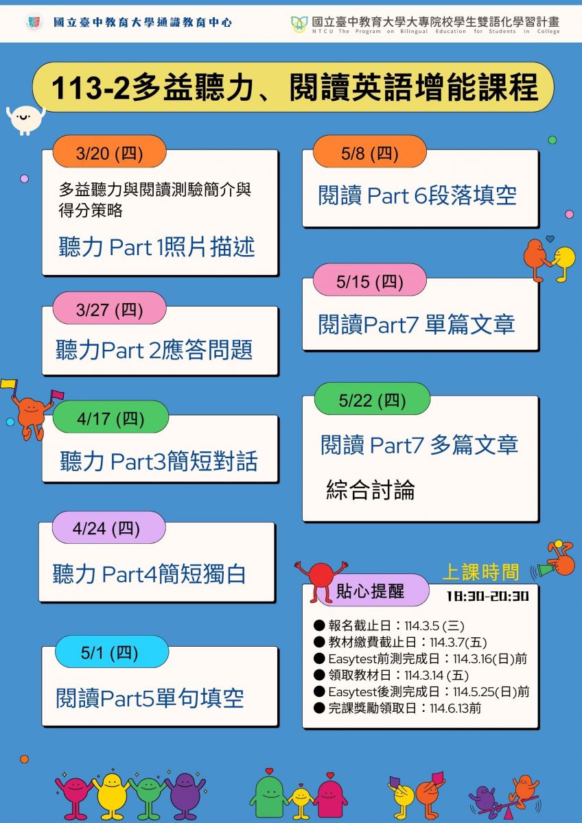 ※ 聯絡方式:通識教育中心外語教育組施小姐 (電話:04-22181227、信箱: ysshih777@mail.ntcu.edu.tw )
