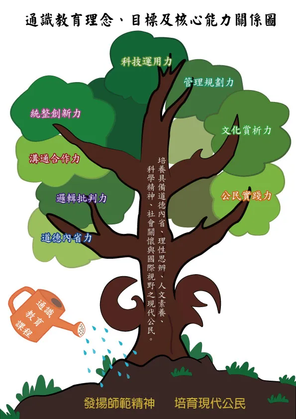 基於此,本校通識教育理念乃為「發揚師範精神、培育現代公民」;具體通識教育目標則為「培養具備道德內省、理性思辨、人文素養、科學精神、社會關懷與國際視野之現代公民」。